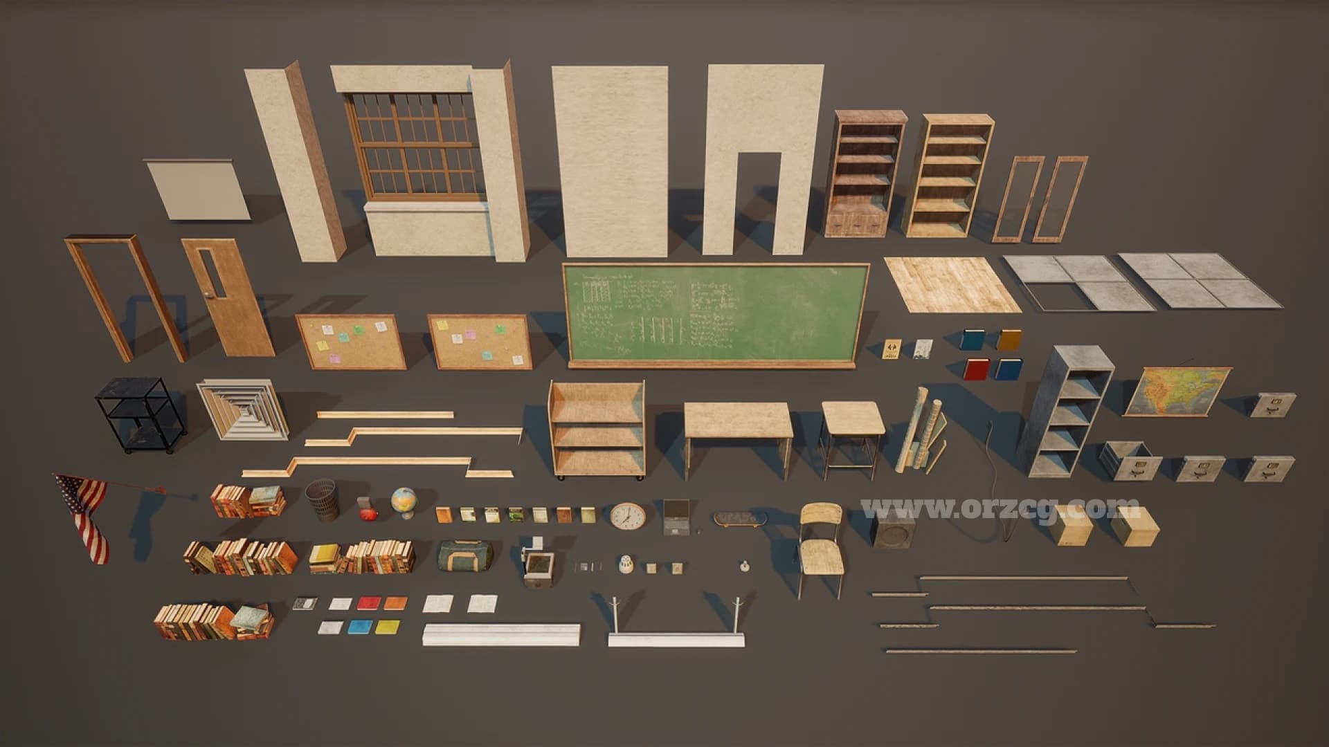 - 道具对象(Props Objects):87 个,包括书籍、笔记本、书架、课桌、椅子、黑板、地球仪、计算器、闹钟等。